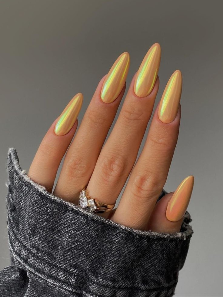A febre das unhas decoradas em amarelo queimado reforça como o acabamento cromado continua a evoluir e se reinventar.