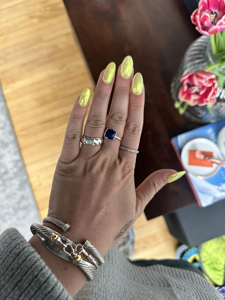 O amarelo cromado não se limita a um único tom ou design. Entre as variações mais populares, a Lemon-Lime Chrome (Limão-Lima Cromado) traz um toque cítrico para as unhas.