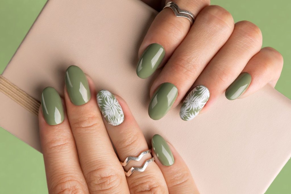 unhas decoradas em tom verde-militar