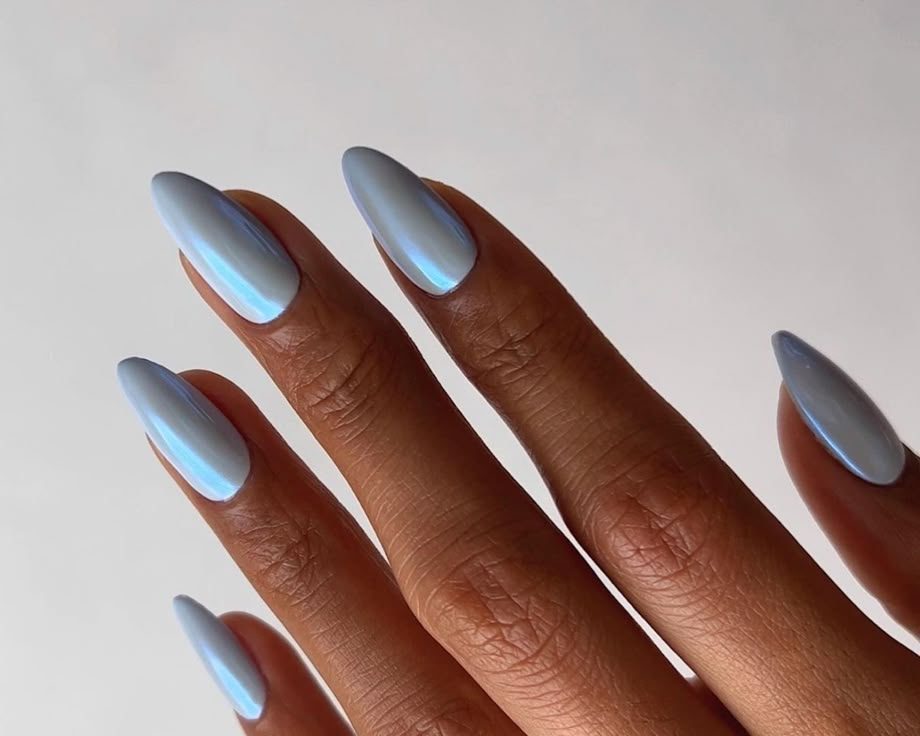 O efeito cromado continua sendo um dos favoritos das apaixonadas por esmaltes, e o azul claro com acabamento espelhado é a versão mais atual dessa tendência.