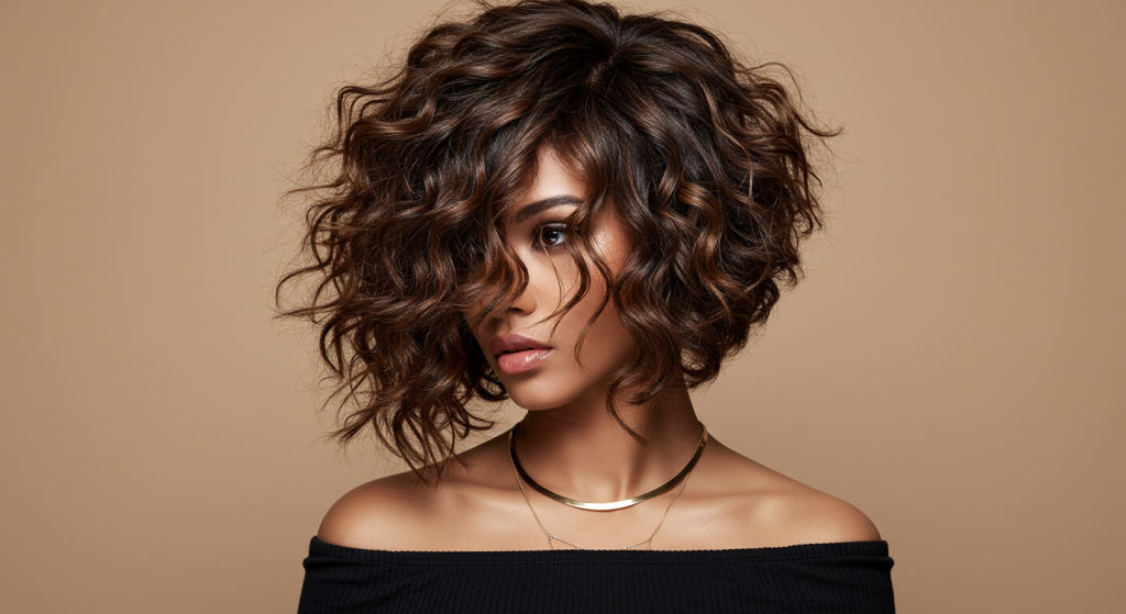 Esse corte combina a estrutura do bob com uma franja cacheada que suaviza o rosto e equilibra o volume.