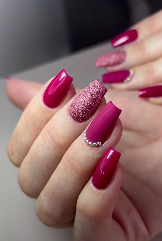 Para quem ama o rosa, contudo busca uma unha de destaque com o formato quadrado, pode apostar no rosa mais escuro. Além disso, uni-lo a pedrarias.
