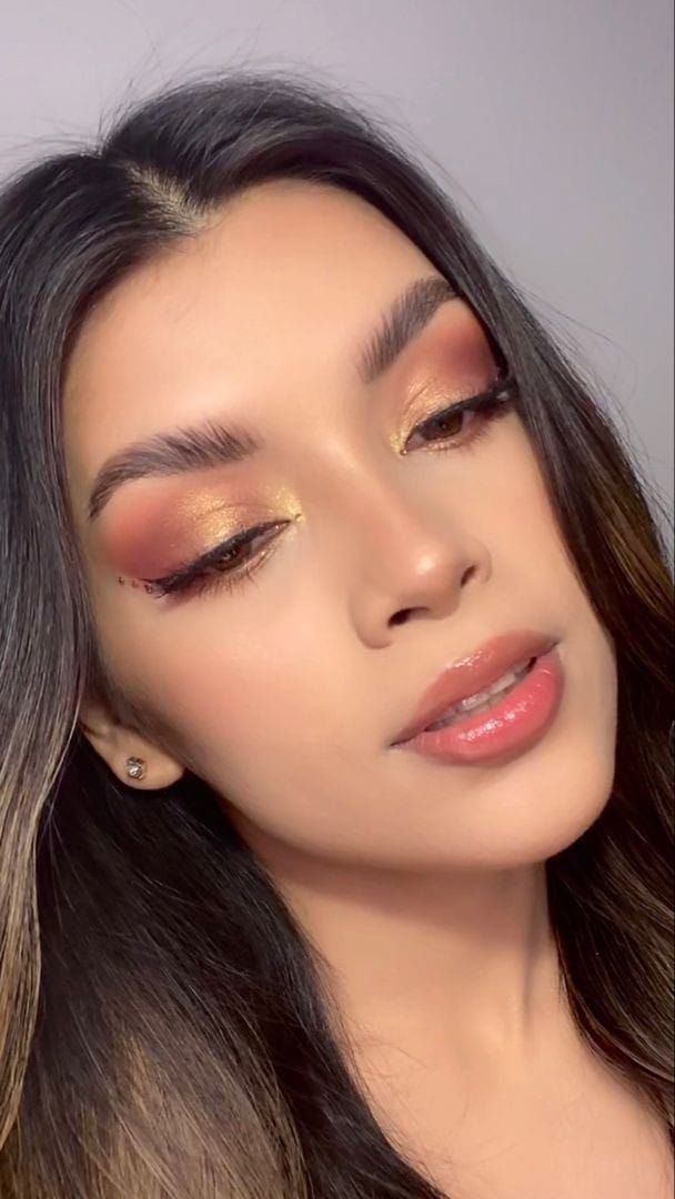 A combinação de marrom e dourado é sempre uma escolha sofisticada, ideal para quem prefere destacar os olhos.