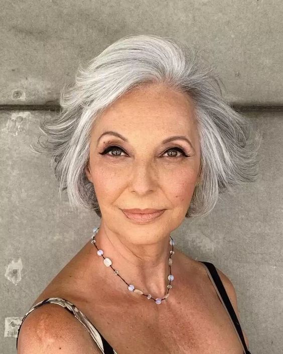 O cinza é uma cor que está em alta e combina muito bem com a maturidade. Esse tom futurista e estiloso é uma opção moderna para mulheres que desejam manter a elegância, mas com um toque contemporâneo. Também combina bem com cortes mais curtos.
