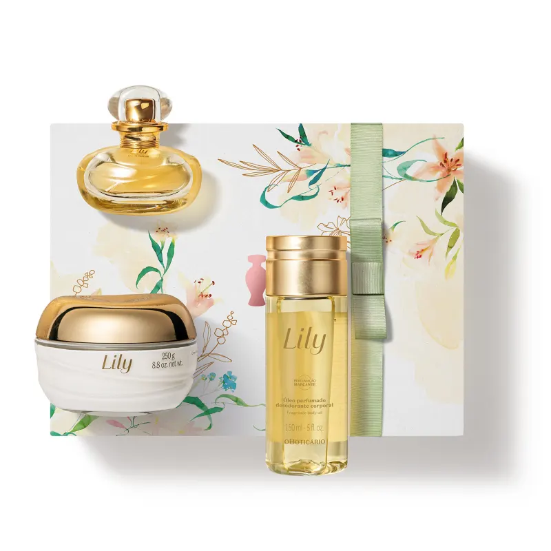 Este conjunto luxuoso inclui o perfume Lily Eau de Parfum em miniatura, assim como creme acetinado corporal e óleo desodorante corporal, garantindo uma experiência completa de cuidado e bem-estar.