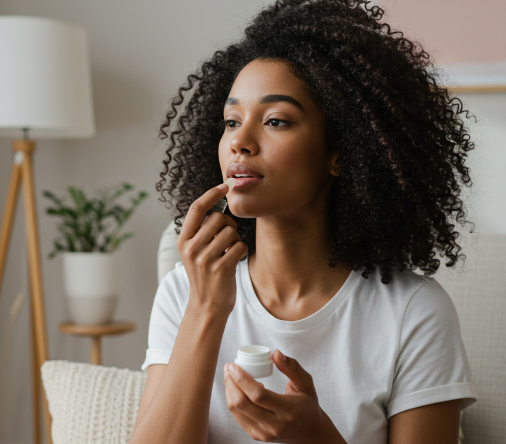 mulher passando hidratando labial