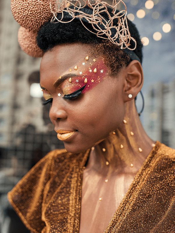 Para aplicar, use uma sombra dourada como base e fixe os pedacinhos com cola de cílios. O resultado é uma maquiagem única e cheia de personalidade.