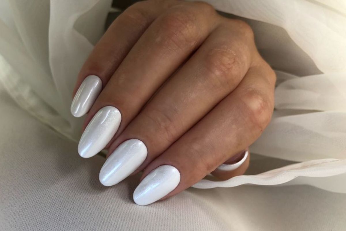 O acabamento perolado confere um brilho sutil às unhas brancas, deixando o visual mais refinado.