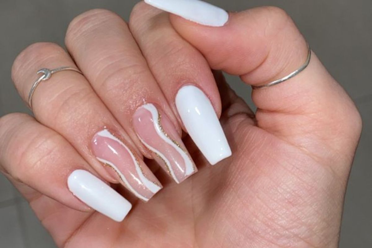 A versão assimétrica traz um ar contemporâneo aos modelos de unhas brancas. Elas podem trazer um formato diagonal, em ondas ou em traços geométricos.