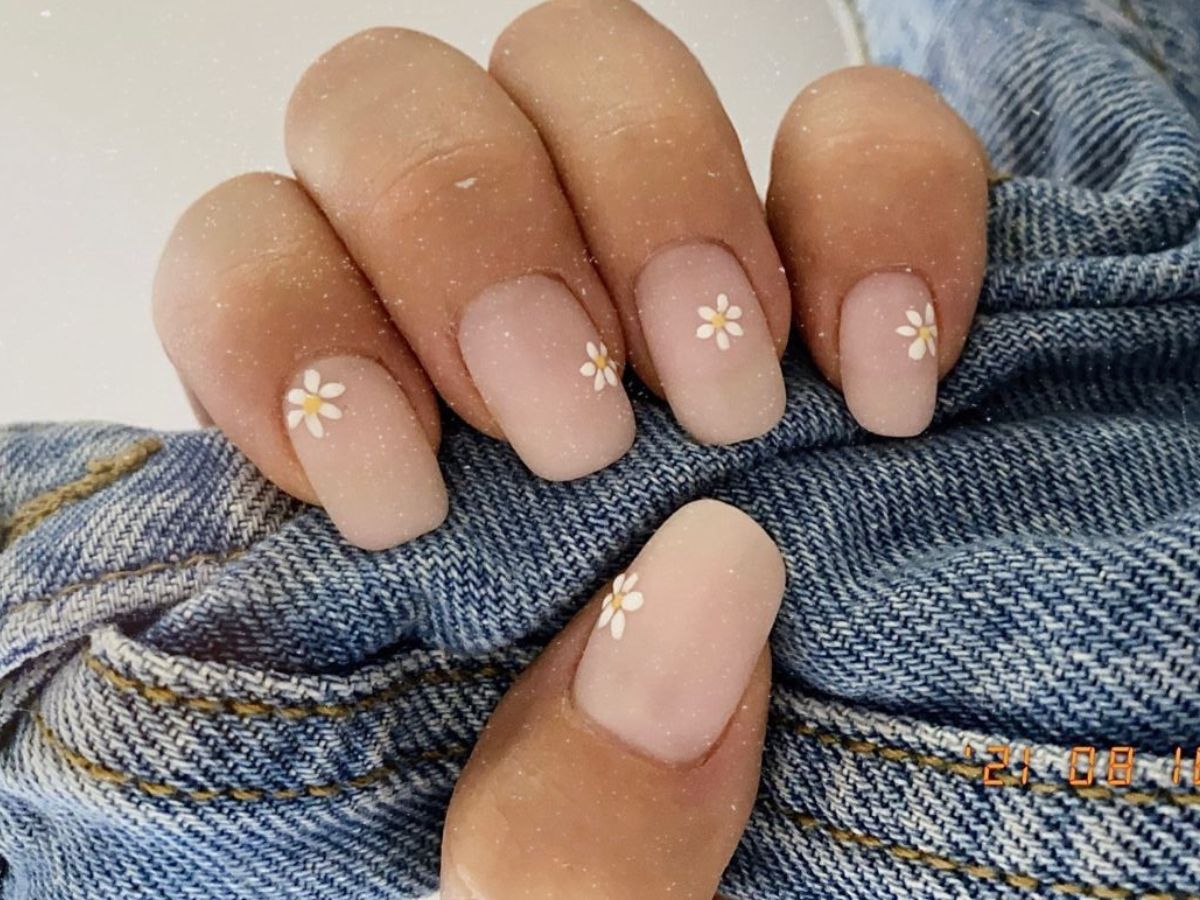 Aqui temos um nude bastante próximo a cor da unha natural, porém, com o diferencial do acabamento fosco. Mas, para quebrar a monotonia e dar um toque descontraído e moderno à produção, o desenho delicado da flor complementa com perfeição essas unhas.