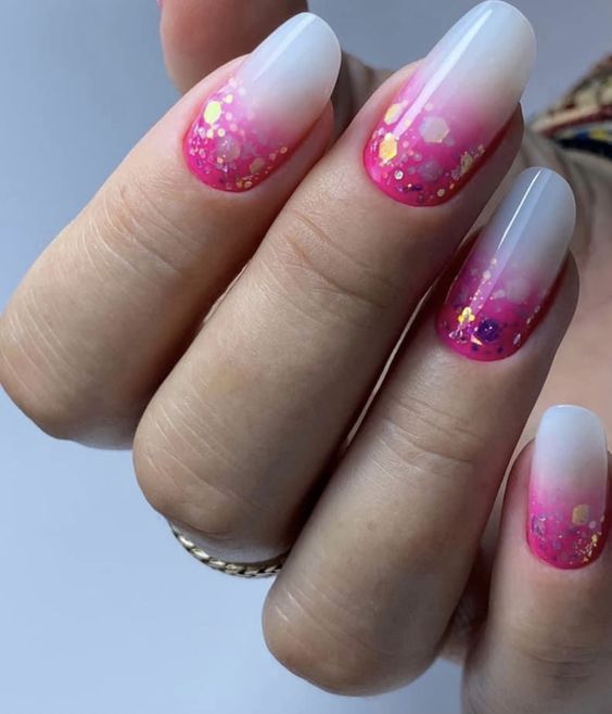 3. Nail art rosa e branco com degradê e brilho tem sido a queridinha