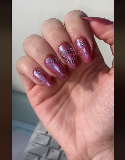 Outra sugestão bem interessante e que bombou no TikTok envolve o esmalte rosa com esmalte perolado. Para finalizá-la, basta criar desenhos de strass como o coração e terá uma nail art incrível para curtir o show da Taylor Swift.