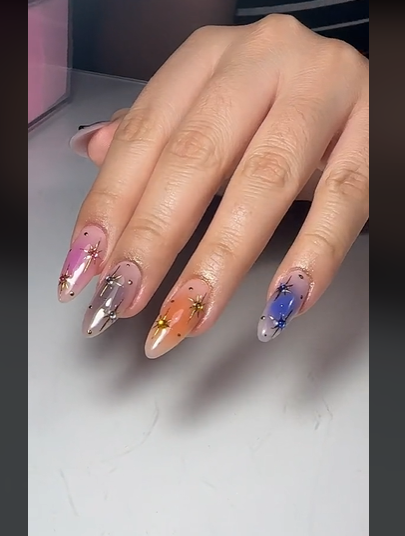 Por fim, terminamos nossa lista de sugestões te contando sobre a nail art decorada com estrelas coloridas. Neste caso, elas trazem uma técnica mais avançada, onde o centro da unha recebe um “blush” colorido, assim como uma decoração toda estrelada.
