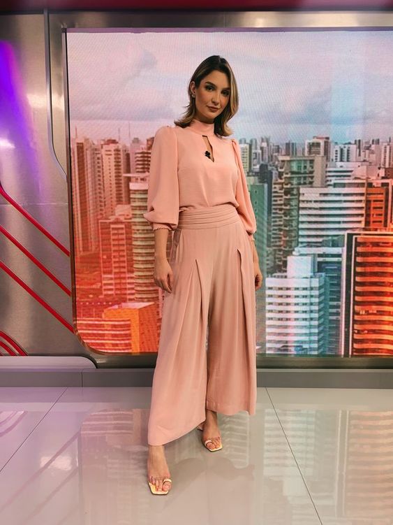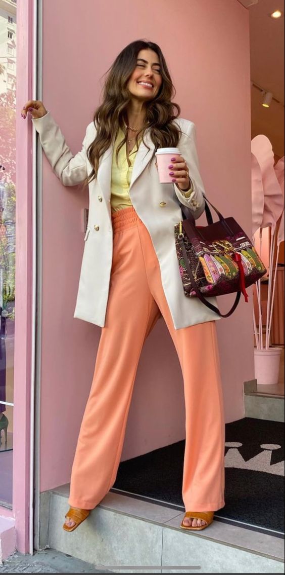 1. Calça pêssego com blazer e camisas de outras cores combinam bem para um look de trabalho