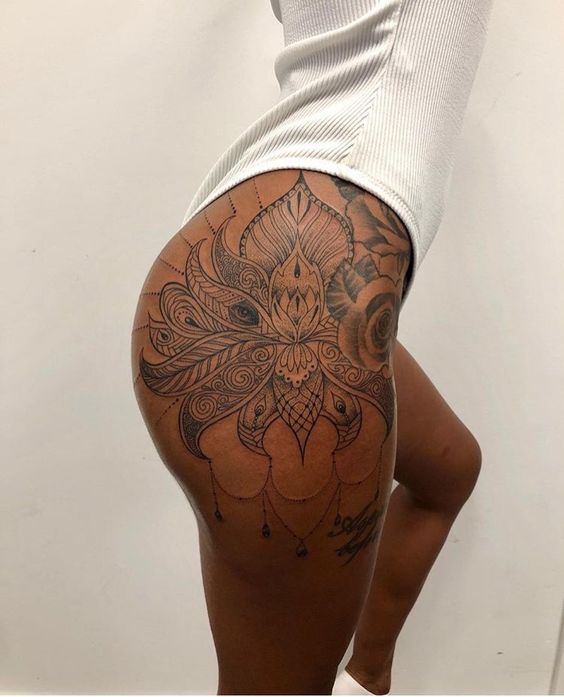 tatuagem feminina de mandala na coxa