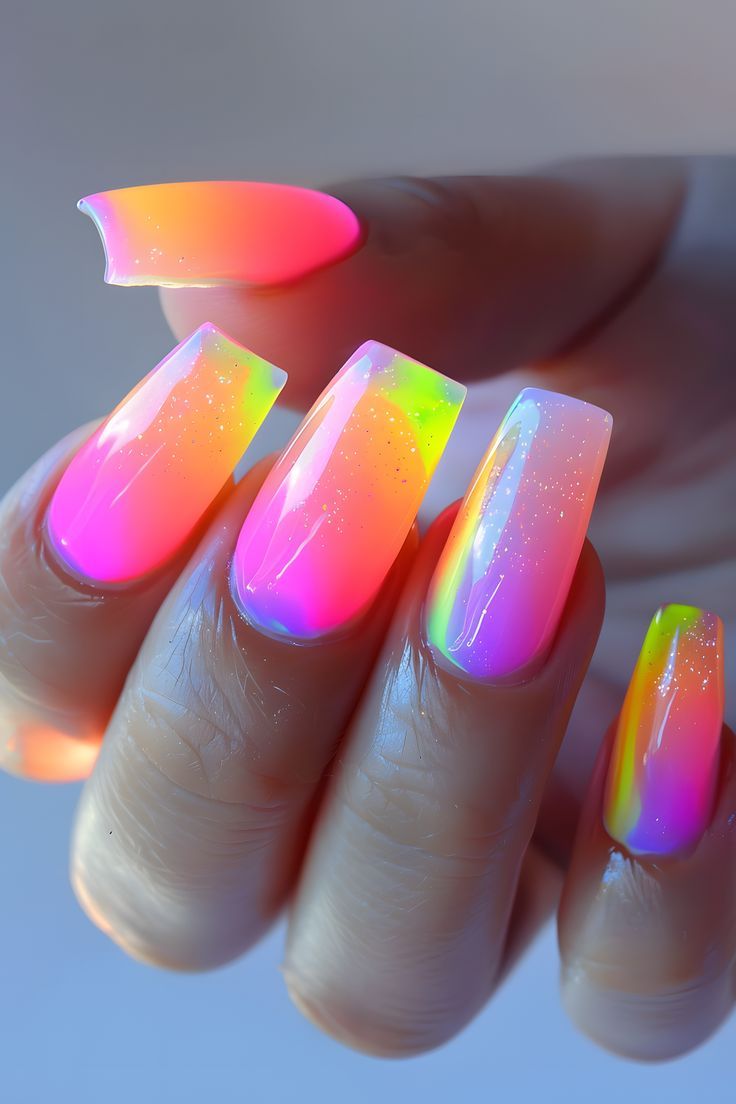 O glitter pode ser aplicado de várias formas: em toda a unha, como um degradê sobre uma base neon ou em detalhes sutis. Além disso, partículas de glitter holográfico criam um efeito de confete, trazendo ainda mais diversão para o visual.