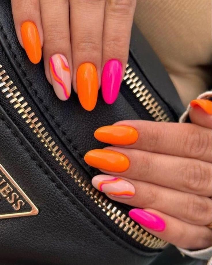 A mistura de cores intensas também será uma tendência forte neste Carnaval. A imagem abaixo traz uma inspiração marcante: unhas em tons de laranja neon e rosa-choque, combinadas com um design ondulado em uma base nude.