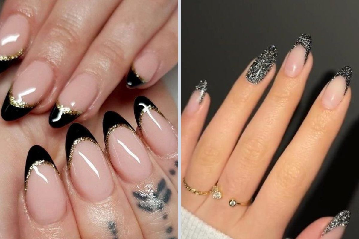 Se você é fã das clássicas unhas francesinhas, pode adotar essa tendência com um toque moderno. A francesinha preta com uma fina listra de glitter na ponta das unhas, ou inteira de glitter é uma escolha elegante e inovadora.