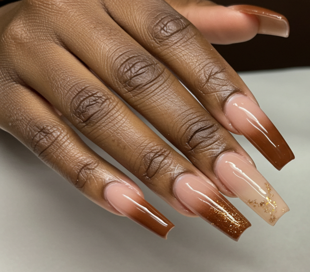 Os tons terrosos continuam sendo tendência, e os marrons são a elite. Vale explorar toda a gama de marrons nas unhas decoradas em acrigel, sem medo.