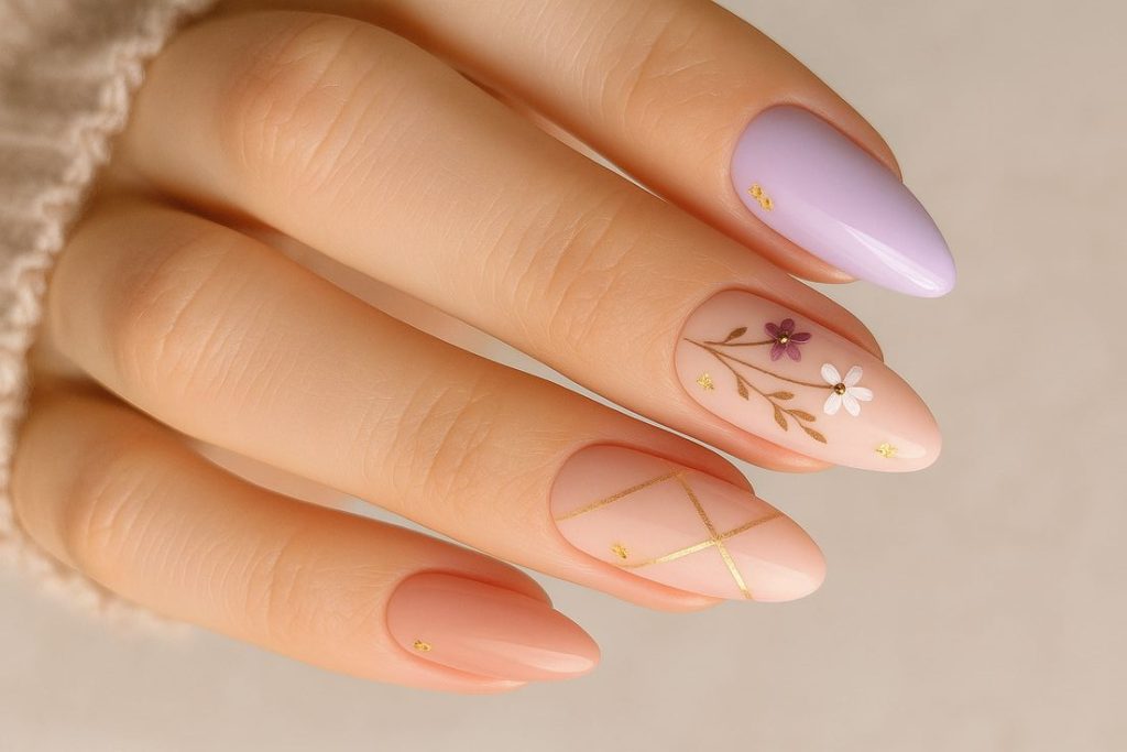 Aqui a vibe é mais suave, com tons claros, desenhos florais e toques dourados. O resultado é uma unha delicada, perfeita para quem curte algo mais romântico e leve.