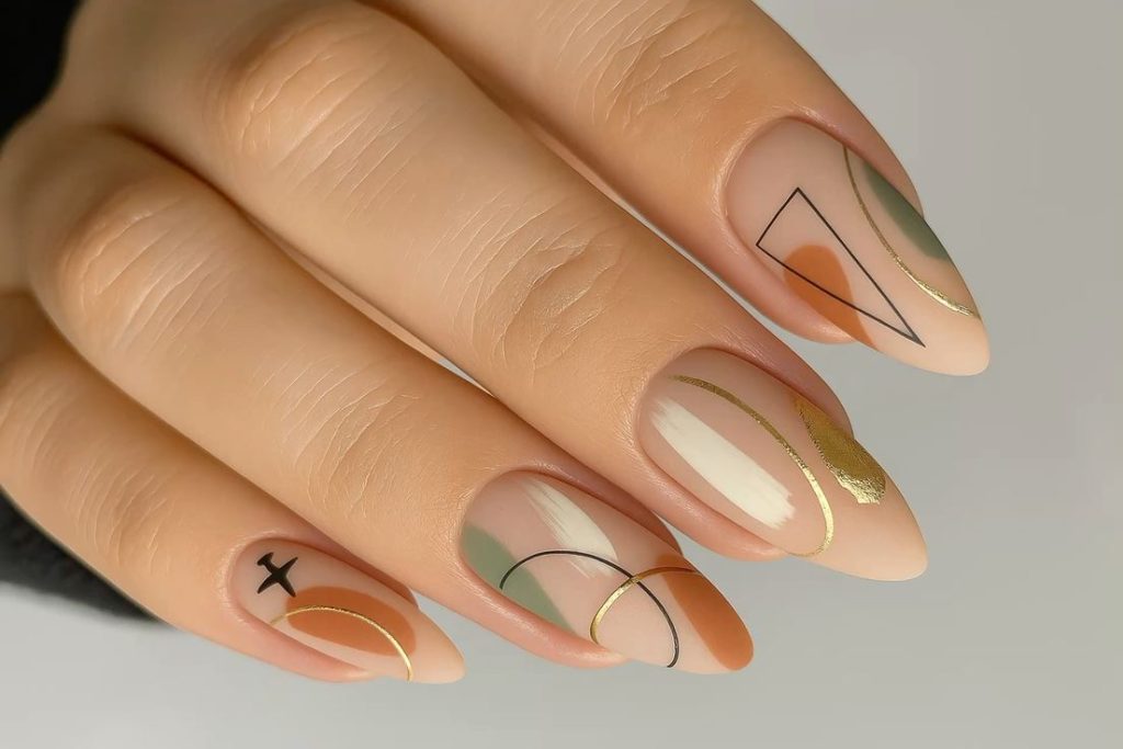 Formas abstratas, cores neutras e linhas douradas fazem dessa unha uma obra de arte. É uma escolha ótima pra quem gosta de inovar e sair do básico.