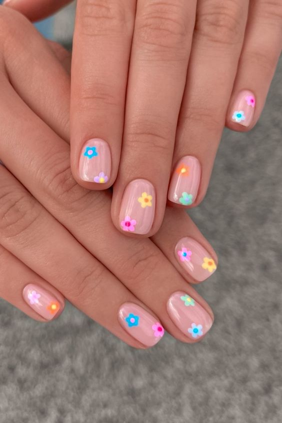6. Nude com flores também ficam super fofas em unhas mais curtas, e são a cara do verão