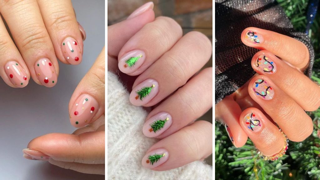 Aposte em unhas com base neutra e pequenos pontos nas cores vermelho, verde e dourado.
