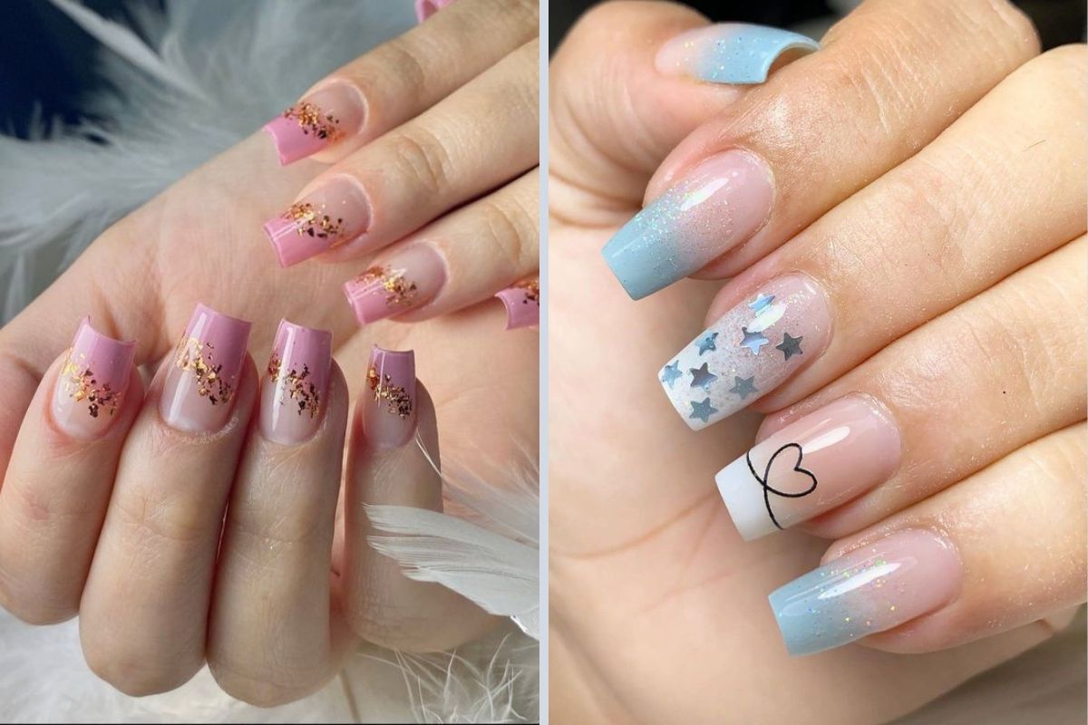 O ombré é alcançado misturando duas cores de esmalte ou gel, resultando em uma aparência gradient que transita de forma elegante de uma cor para outra. Para o toque final, o glitter acrescenta um brilho sutil ou deslumbrante, dependendo da sua preferência.