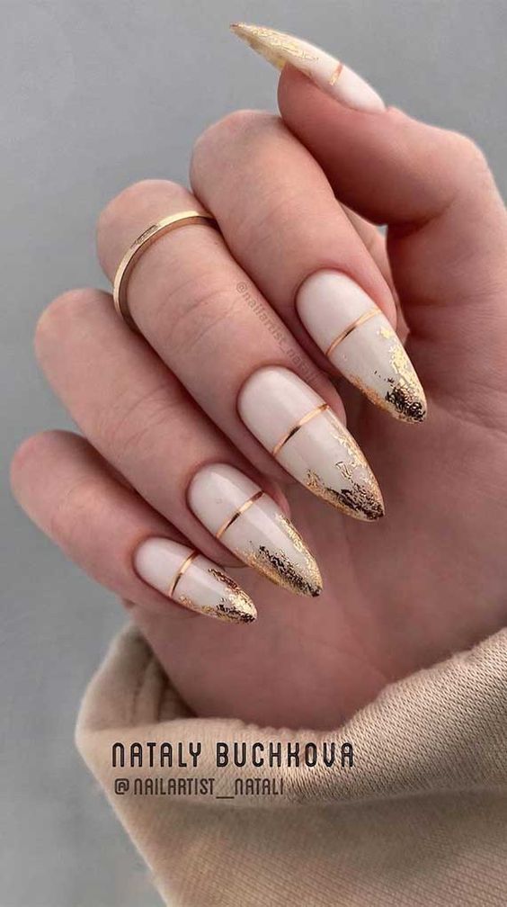 Considerado uma cor festiva e vibrante, o dourado aparecerá sem medo nas unhas femininas no novo ano. Assim, detalhes com a cor serão vistos como sofisticados e cheios de significado. Aposte na ponta decorada e terá uma ótima opção em 2024 sem dúvidas.