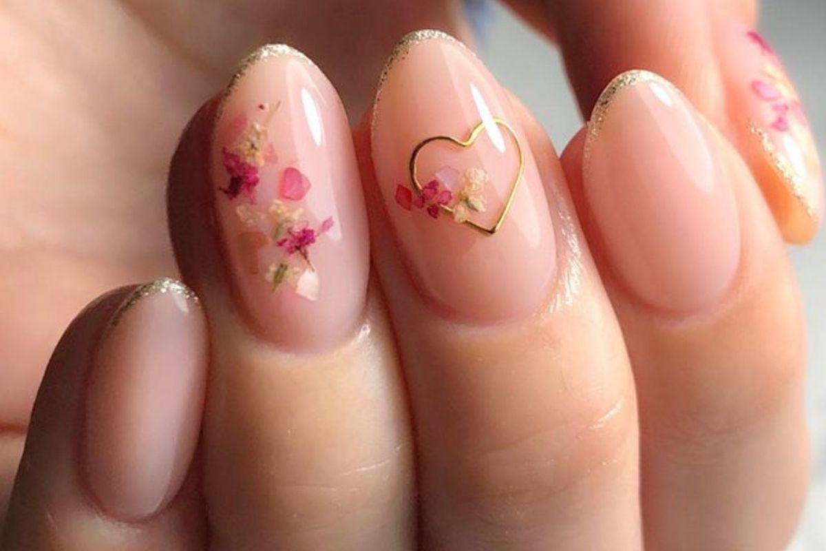 Nesse estilo, utiliza-se uma base transparente sobre a qual se aplicam pequenas flores secas, posicionando-as apenas nas pontas das unhas. Esse design adiciona um charme único à sua manicure, perfeito para quem adora detalhes sutis e femininos.
