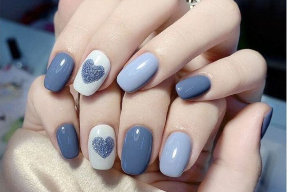 Se você prefere um estilo mais romântico, as unhas em tons de azul com corações de glitter são uma opção encantadora.