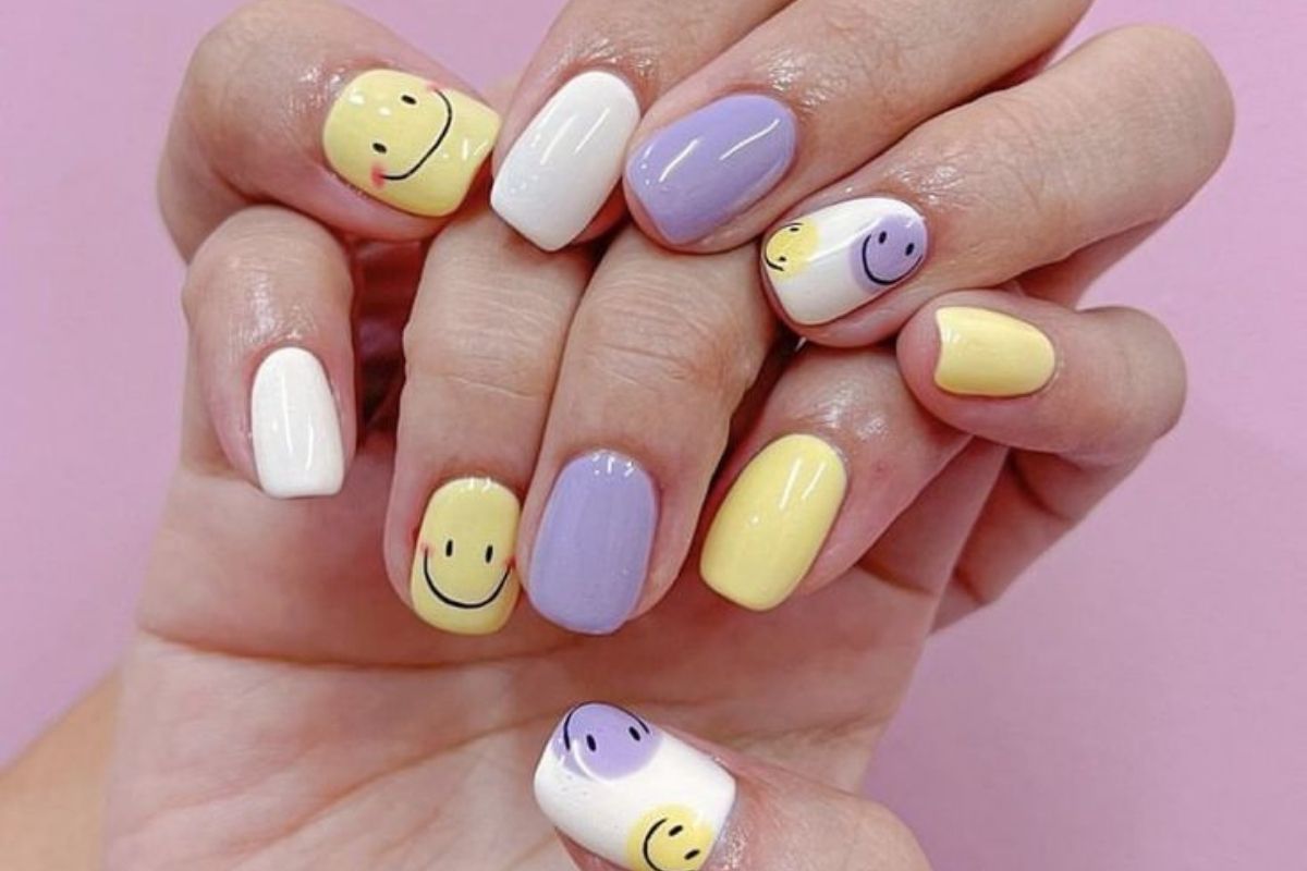 Unhas em azul e amarelo e carinhas felizes