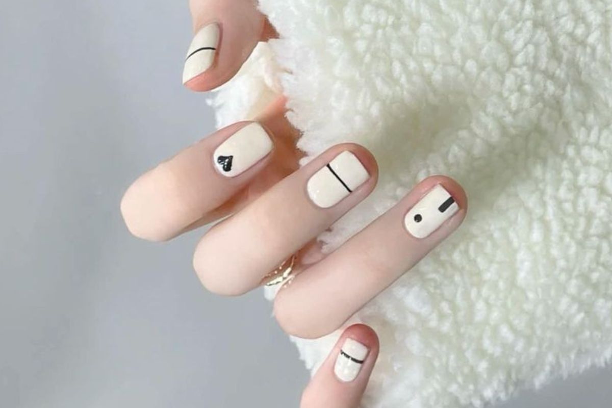 Aqui, três unhas apresentam apenas uma linha fina em preto, uma possui um coração, e outra apresenta sinais geométricos também em preto. Essas unhas são ideais para quem deseja um estilo mais discreto, mas ainda assim, cheio de atitude.