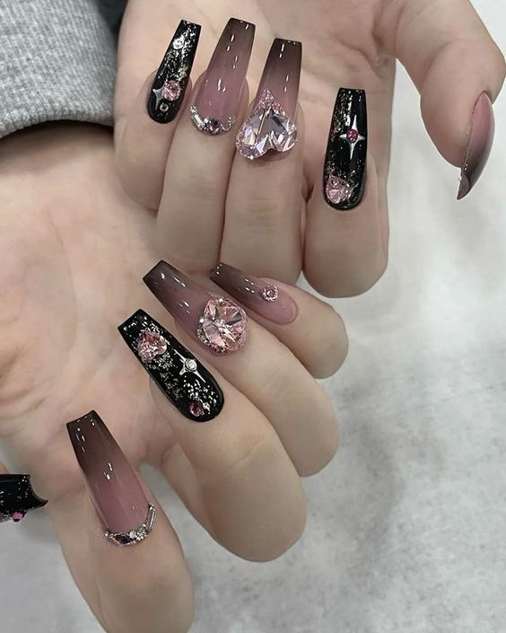 3. Unhas pretas com degradê proporcionam um visual incrível com pedrarias